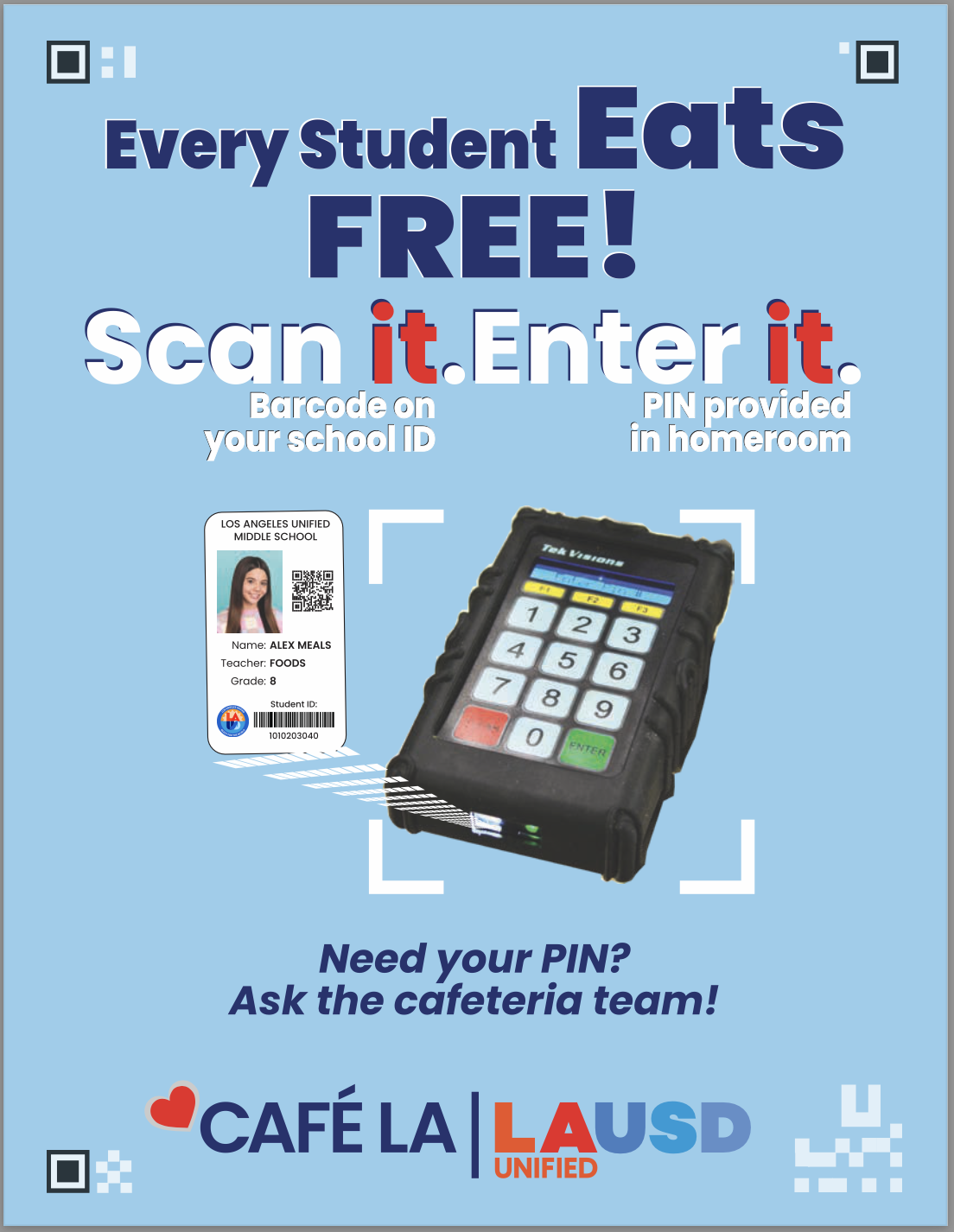 Beginning Monday, October 6, 2025, you must SCAN YOUR STUDENT ID or Enter your PIN [Student ID] to get lunch at the cafeteria.